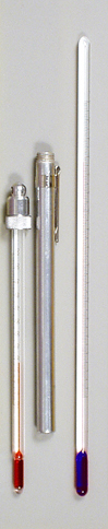 The Model T-3 is a pocket-sized, wide-range, total-immersion, mineral-filled glass thermometer. The red disazo-type non-toxic dye is easily viewed against the white background. It is supplied in an aluminum protective casing with a ring on top and a pocket clip.