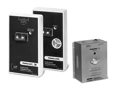 The Primalert™10 is a compact monitor that responds to scattered radiation and can be mounted anywhere in the teletherapy room. A pair of bright red lamps on the instrument face flash a warning when the source is exposed, and they continue to flash until safe conditions are re-established. The flashing green operator indicator light continuously monitors the background radiation and provides a visible indication that the instrument is functioning. The monitor is supplied with a self-stick bracket for wall mounting.