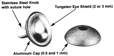 Tungsten eye shields have been developed to provide greater shielding than lead for the same thickness and superior electron scatter properties. Tungsten eye shields can be gas sterilized or autoclaved. Each tungsten eye shield has a removable 1mm thick and 0.5mm thick anodized aluminum cap (both are included with each eye shield) that additionally reduces radiation backscatter to the eyelid. The entrance dose rate will determine whether the 1mm or 0.5mm aluminum cap is to be used. The eye shields can be used without the aluminum cap when treating superficially. Tungsten shields are available in 2mm and 3mm thicknesses and five different diameters. A stainless steel knob provides a convenient handle.